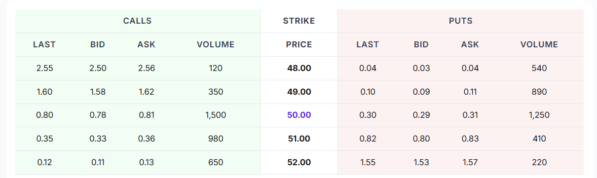 - Bid/Ask: The current prices at which you can sell (bid) or buy (ask) the option. The difference is the bid-ask spread.