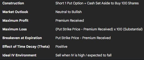- Mechanics: An investor sells a put option and sets aside enough cash to purchase 100 shares at the strike price if assigned. This cash collateral "secures" the put.