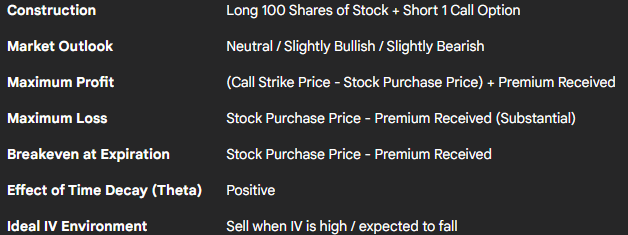 - Mechanics: An investor owning at least 100 shares of a stock sells one call option against that holding. The long stock "covers" the short call's obligation, avoiding the unlimited risk of a naked call.