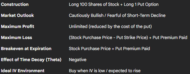 - Trade-offs: The cost of the put premium reduces total profit if the stock appreciates. If the stock rises or stays flat, the put expires worthless, and the premium is a sunk cost.
