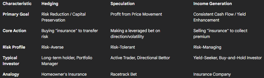 The three uses of options—hedging, speculation, and income generation—are not mutually exclusive. A sophisticated investor might use all three: selling covered calls for income, using that income to buy puts to hedge the portfolio, and using separate capital to speculate with long calls in another sector / asset class.