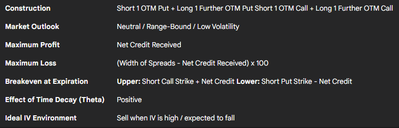 Mechanics: An iron condor combines a bull put spread and a bear call spread, resulting in a double net credit from two credit spreads.