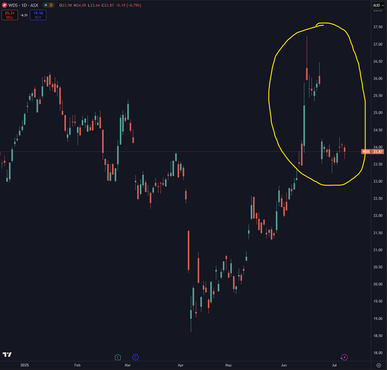 Iran and Israel declared war in June; details of that are for another day. The situation is that Oil suppy was in shock and we saw Brent Crude Futures rally 20% + in a number of days. As expected, Oil producers on the ASX, WDS and STO followed suit.